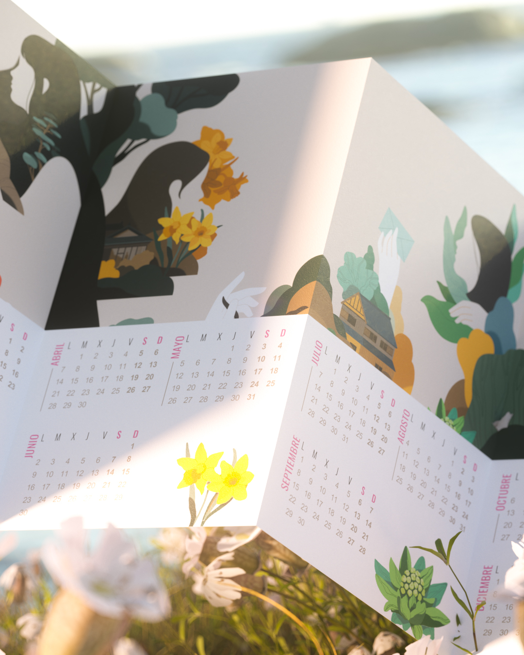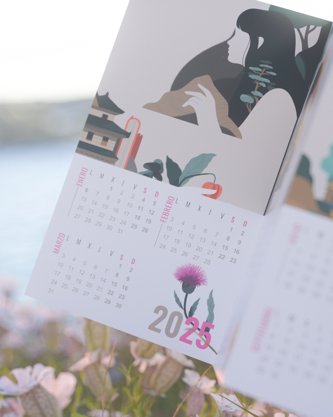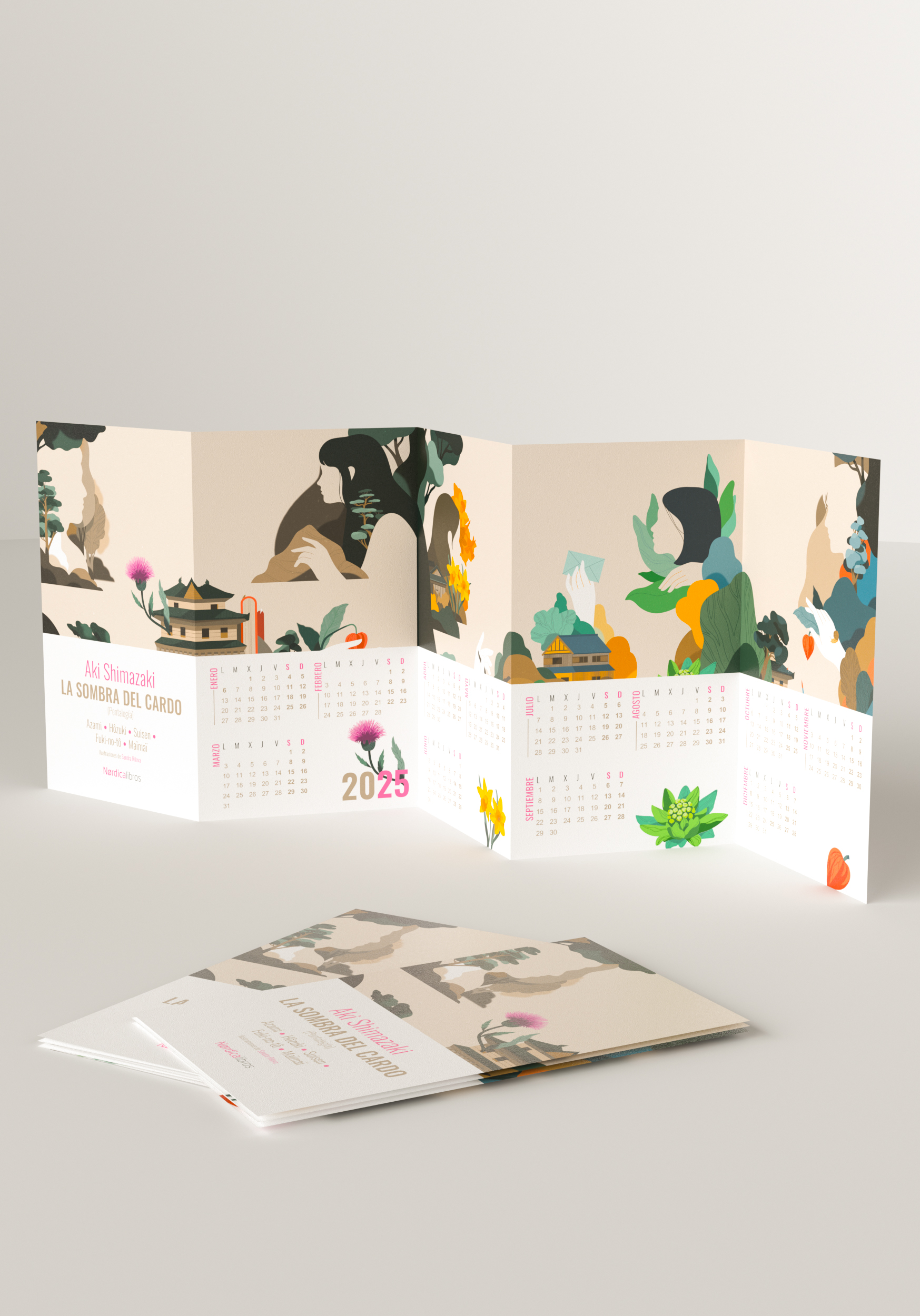 Biombo-calendario 2025 con las ilustraciones que Sandra Rilova ha creado para la pentalogía La sombra del cardo, de Aki Shimazaki.