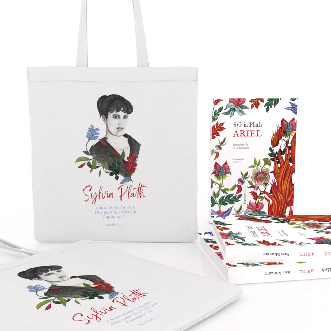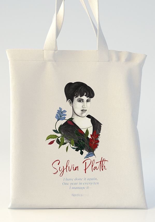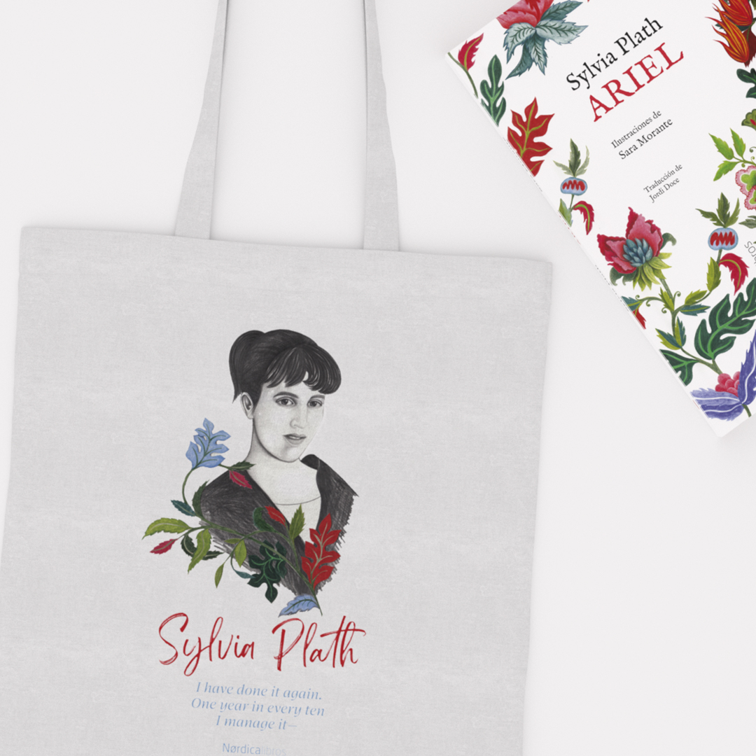 Bolsa de algodón orgánico que rinde homenaje a Sylvia Plath con motivo de la publicación de su célebre poemario Ariel. Ilustración de Sara Morante.