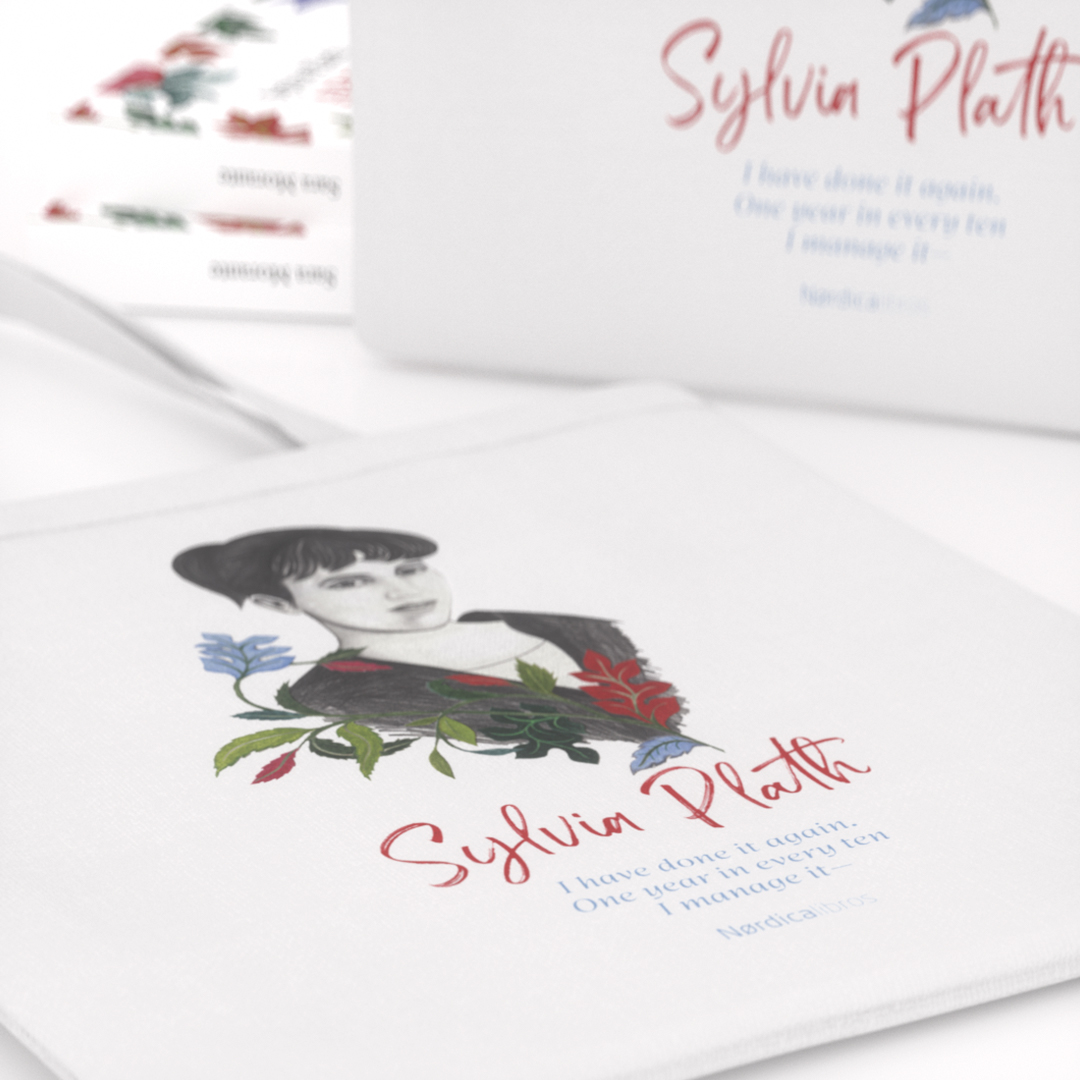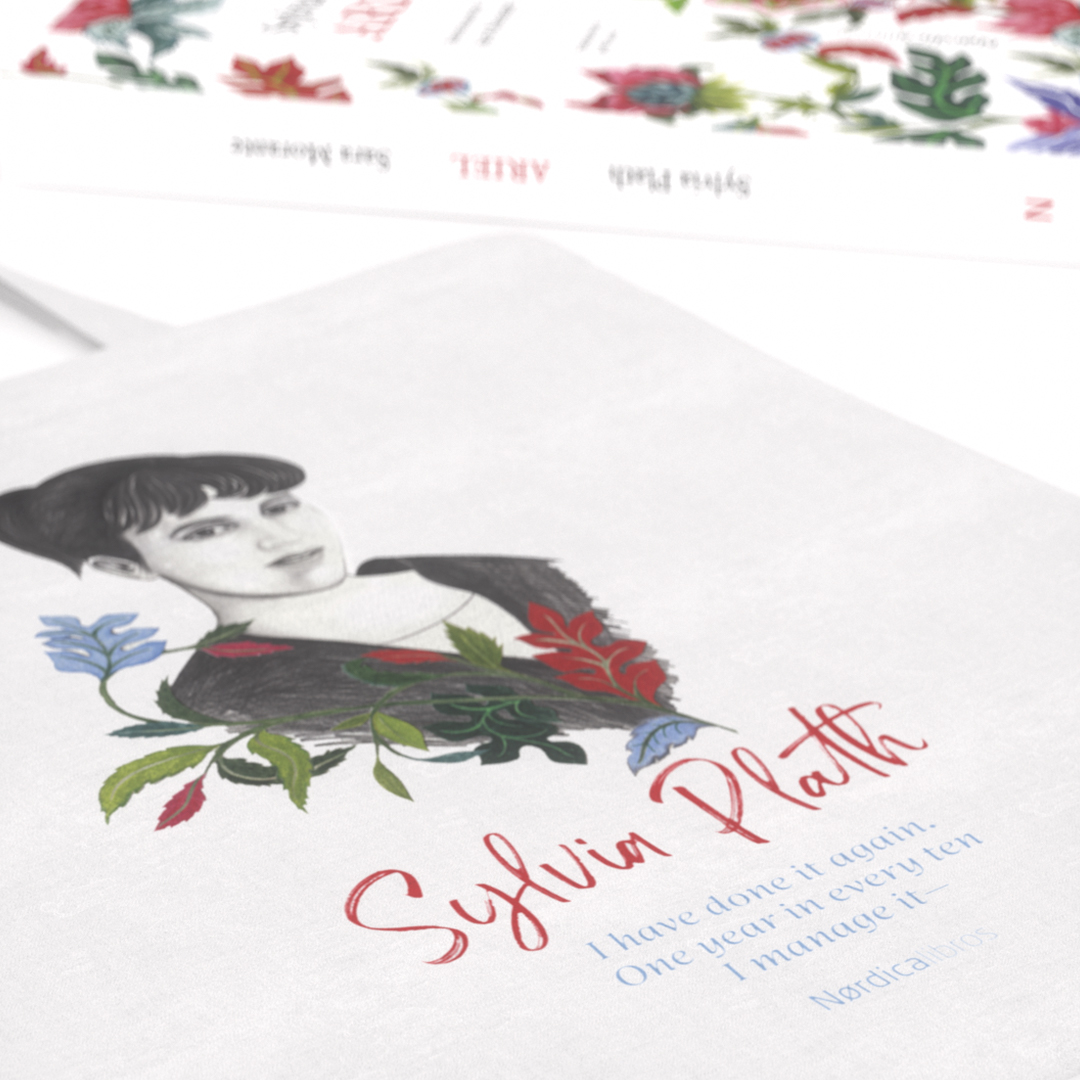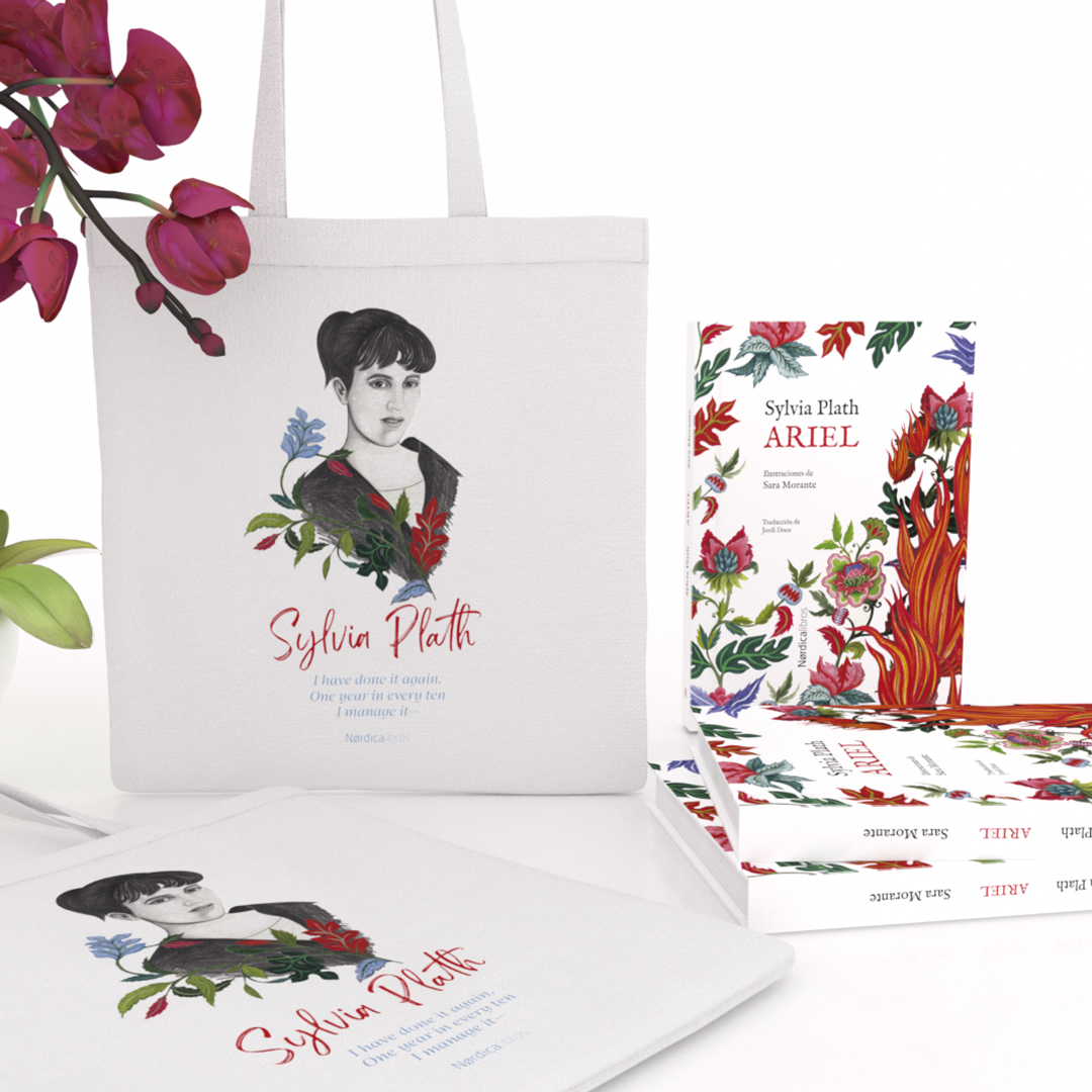 Bolsa de algodón orgánico que rinde homenaje a Sylvia Plath con motivo de la publicación de su célebre poemario Ariel. Ilustración de Sara Morante.