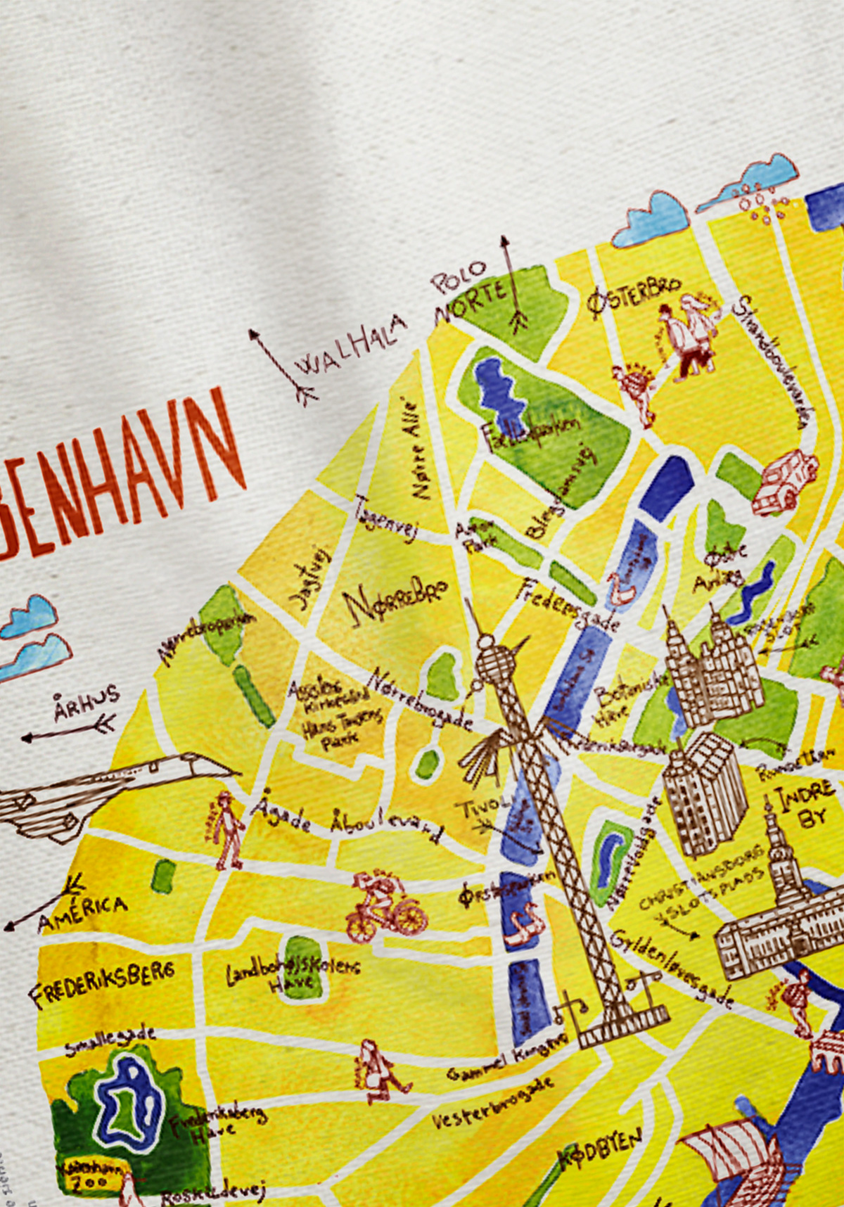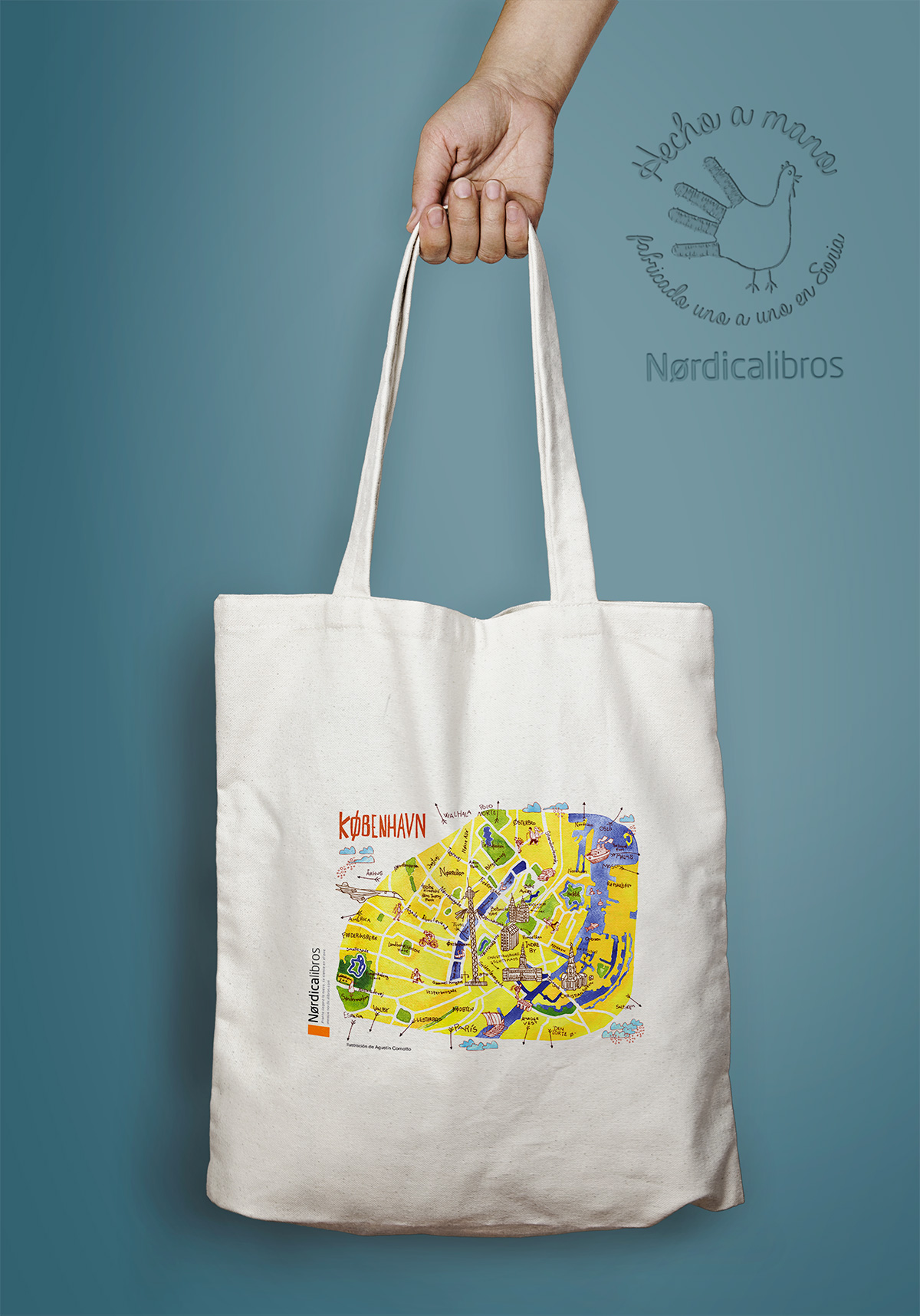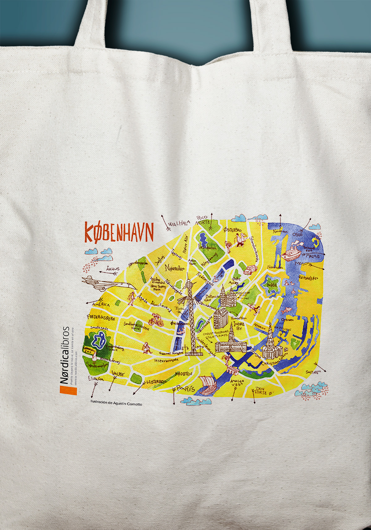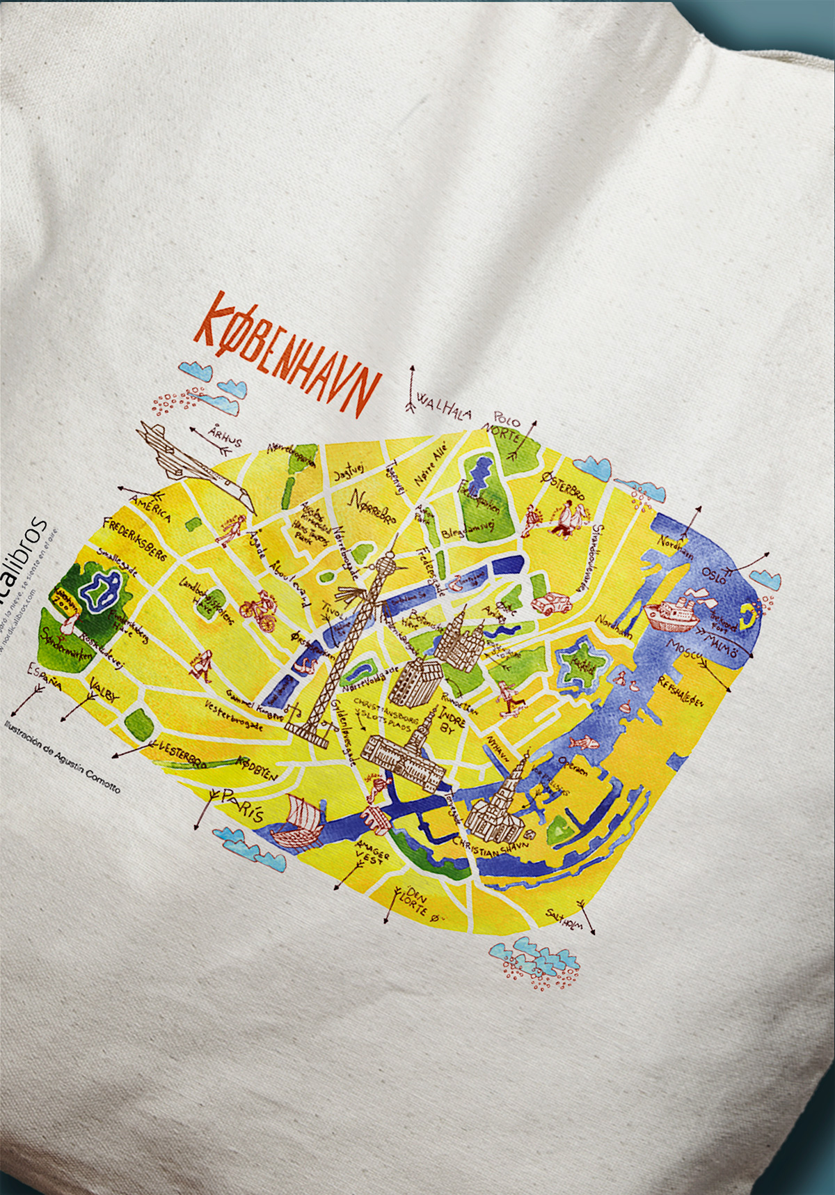 Bolsa de algodón orgánico con un fantástico mapa de Copenhague ilustrado por Agustín Comotto para el libro Copnhague huele a París. Estas bolsas se imprimen una a una en Soria.