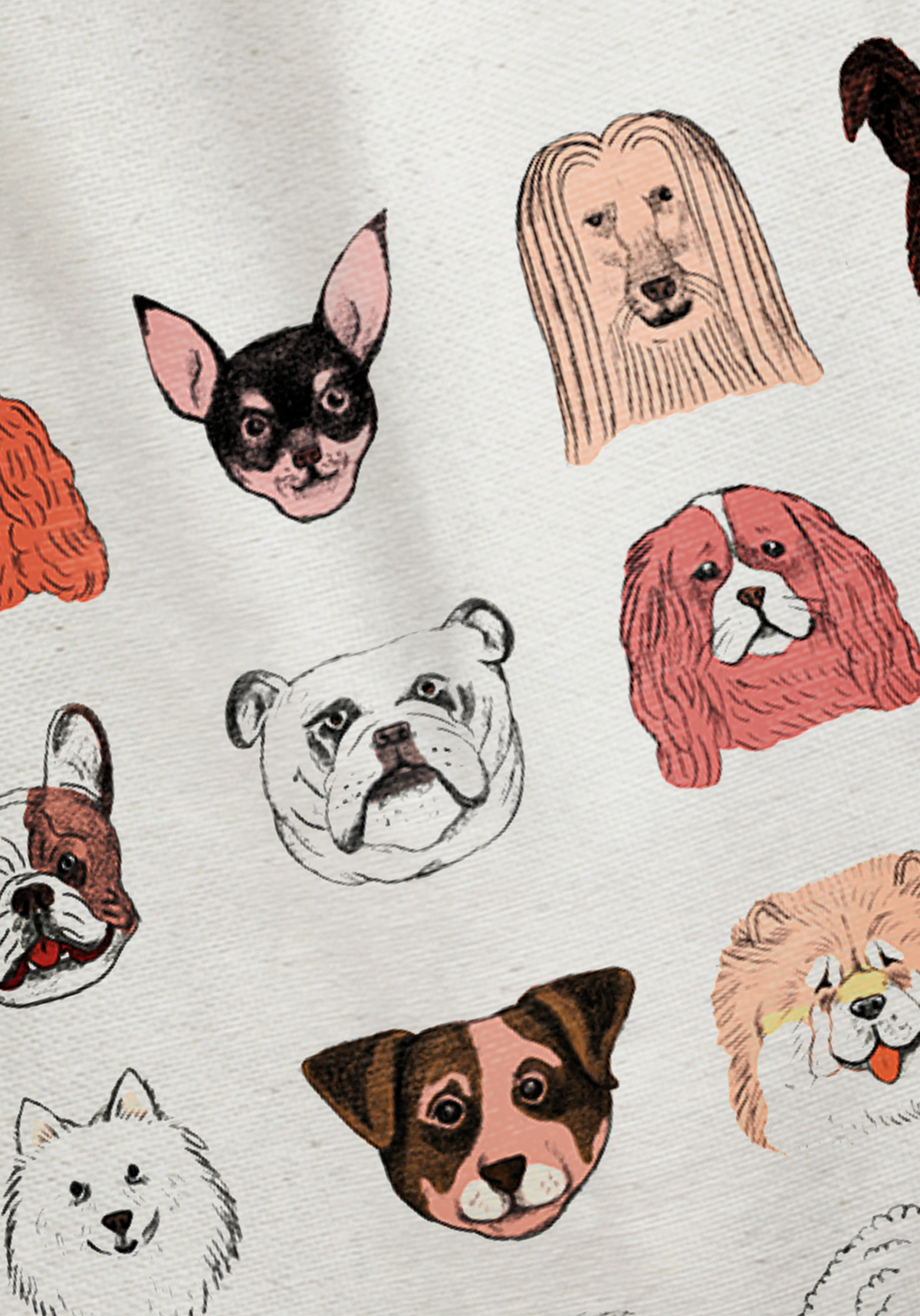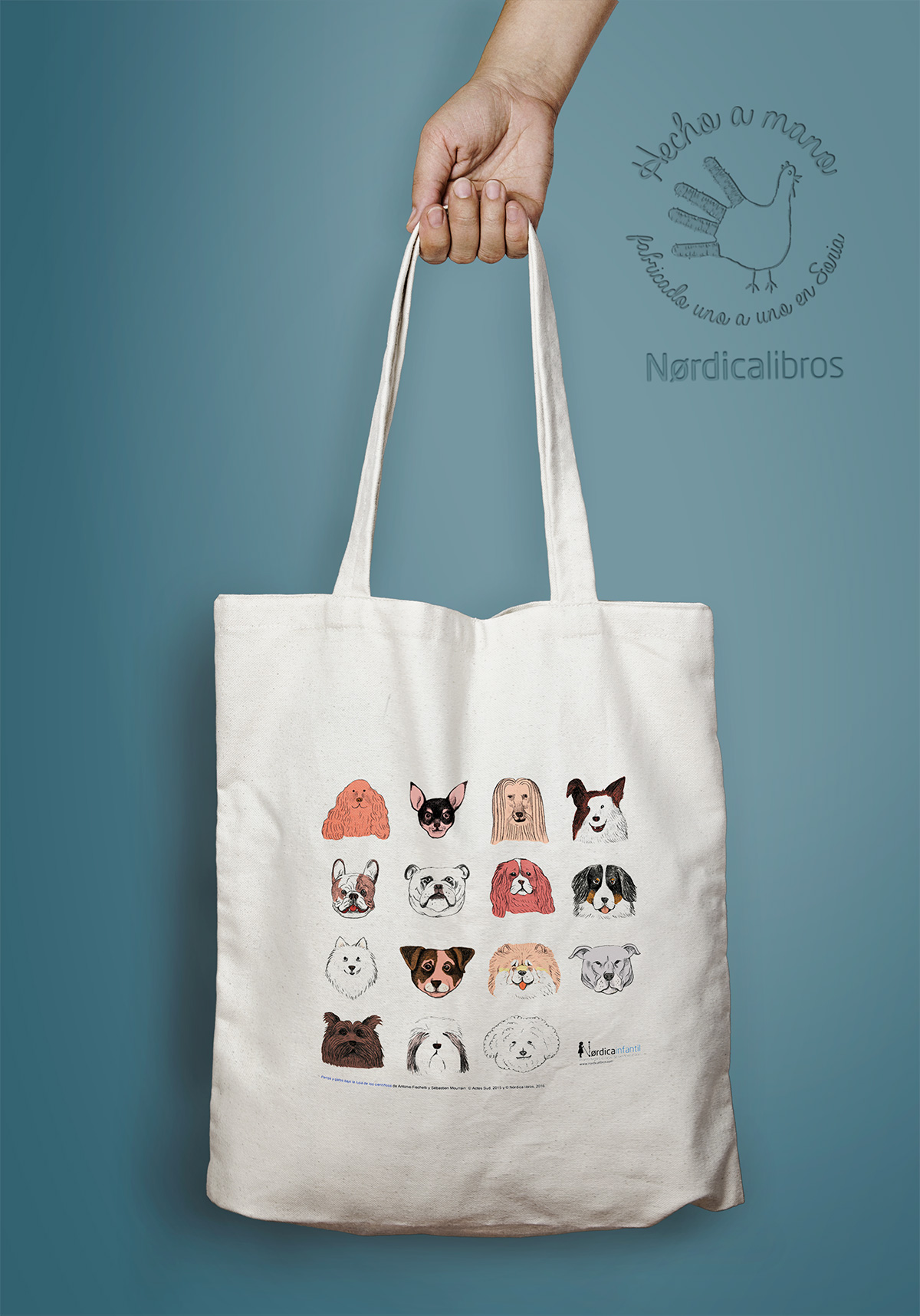 Bolsa de algodón orgánico con caras perrunas ilustradas por Sébastien Mourrain para el libro Perros & Gatos bajo la lupa de los expertos. Estas bolsas se imprimen una a una en Soria.