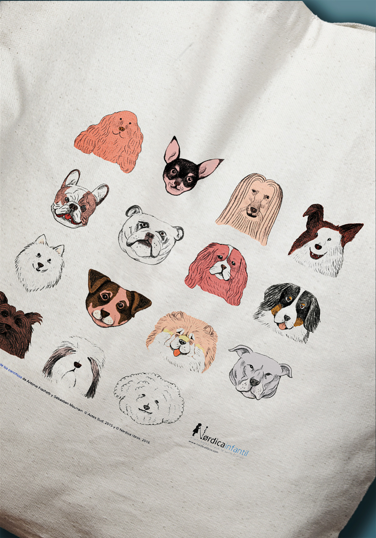 Bolsa con ilustración de razas de perros para el libro Perros & Gatos bajo la lupa de los científicos