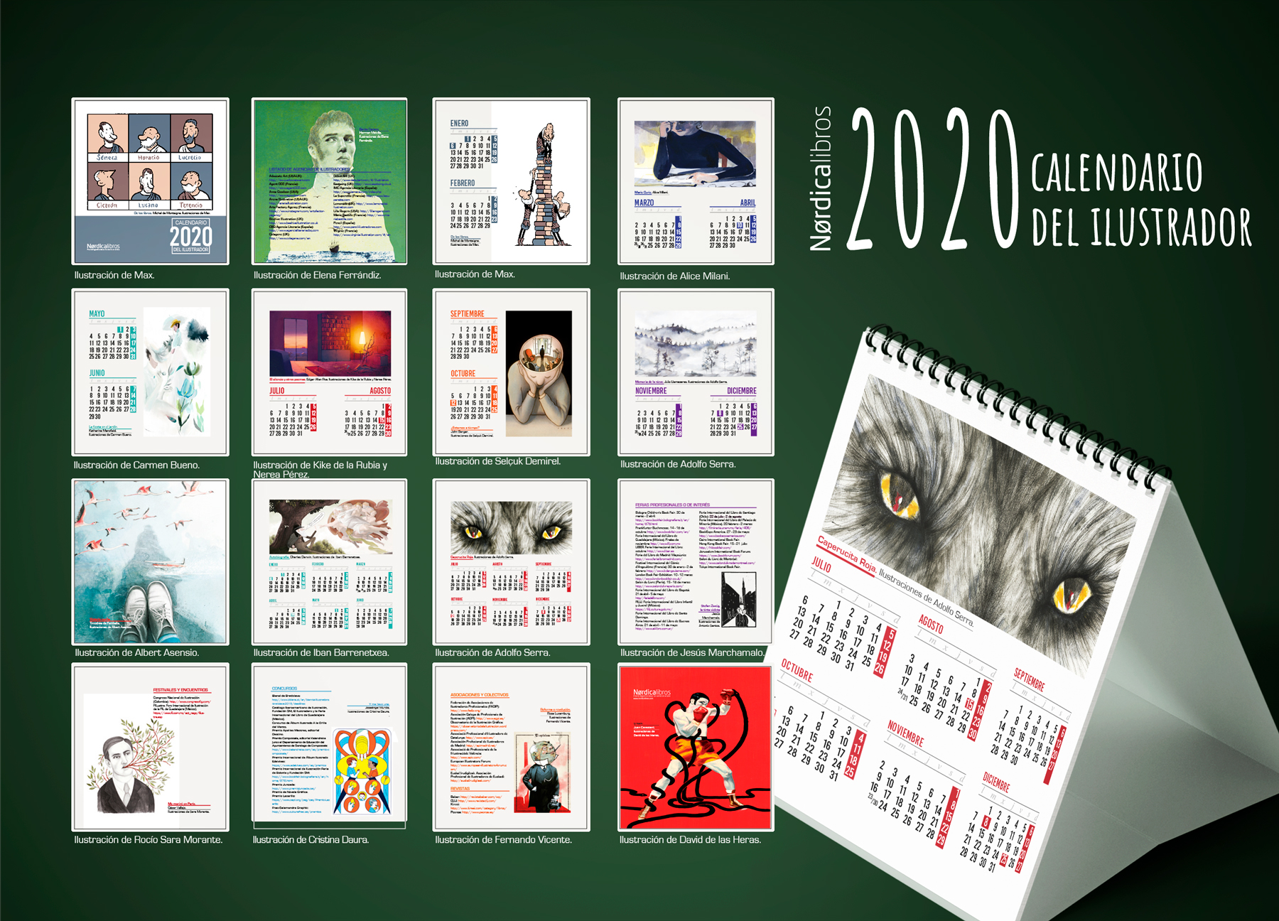 El Calendario del Ilustrador 2020 es el producto literario imprescindible para todo amantes de los libros ilustrados. También es de gran utilidad para profesionales y aficionados a la ilustración, pues incluye información sobre ferias, agencias y eventos relacionados con este oficio. En el calendario de este año podréis encontrar ilustraciones de Max, Kike de la Rubia, Carmen Bueno, Elena Ferrándiz, Iban Barrenetxea y muchos otros.